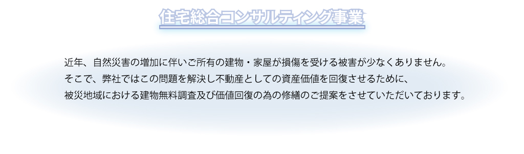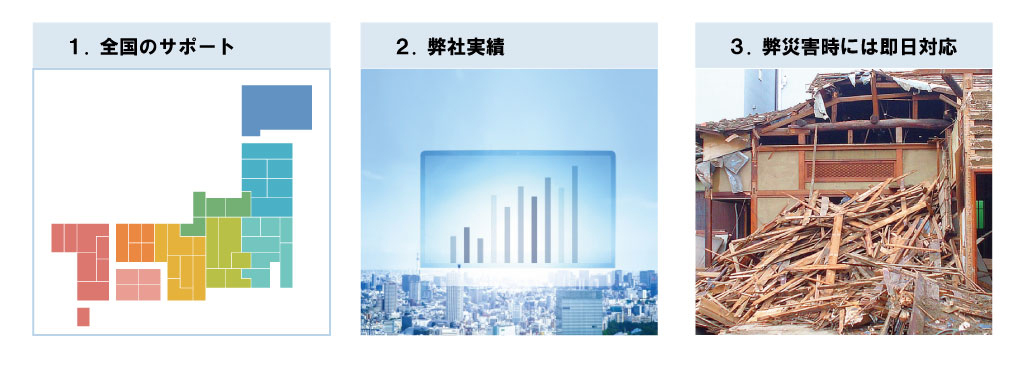 【デジタル技術の必要性】 2021年にデジタル改革関連法が施行され、各業界でデジタル化の波が加速しています。 しかし、建物調査においてはまだアナログ文化が根強いと言われる業界のひとつです。 それに反して、自然災害件数は変動を伴いながらではありますが増加傾向にあります。 こういった背景のある日本においては、今後の建物調査はさらに重要になります。 私たちはデジタル化を積極的に取り入れ、より高度な、さらにシンプルな仕組み化を 進めて参ります。 【ワンストップ戦略】 デジタル技術や様々なソリューションを元に、被害調査からデータベース管理、 被害評価までをワンストップで解決します。 被害調査:ドローンなどを用いた撮影の効率化、損傷位置の記録に関するデジタル化などの 全ステークホルダーによる調査 データベース管理:調査データの一元化 被害評価:遠隔地の技術者の活用、目的別の評価 【会員データベース】 一度、サポートさせていただいたお客様は、 弊社の会員として引き続きサポートさせていただいております。 また、台風や災害の際には、即日対応により応急処置をさせていただいております。 会員第一に、最善を尽くさせていただきます。 【プロフェッショナルな住宅調査】 自然災害鑑定士の資格を持った、確かな知見と豊富な経験値のある調査員が、 見落としてしまいがちな被災個所を漏れなく探し、機能的な損傷だけでなく 非機能的な損傷へも発見し、未来の災害に備えることができます。 お客様が安心できる暮らしを実現いたします。 【コールセンター】 360日稼働のコールセンターにより、お客様に安心サポート体制を築いております。 |